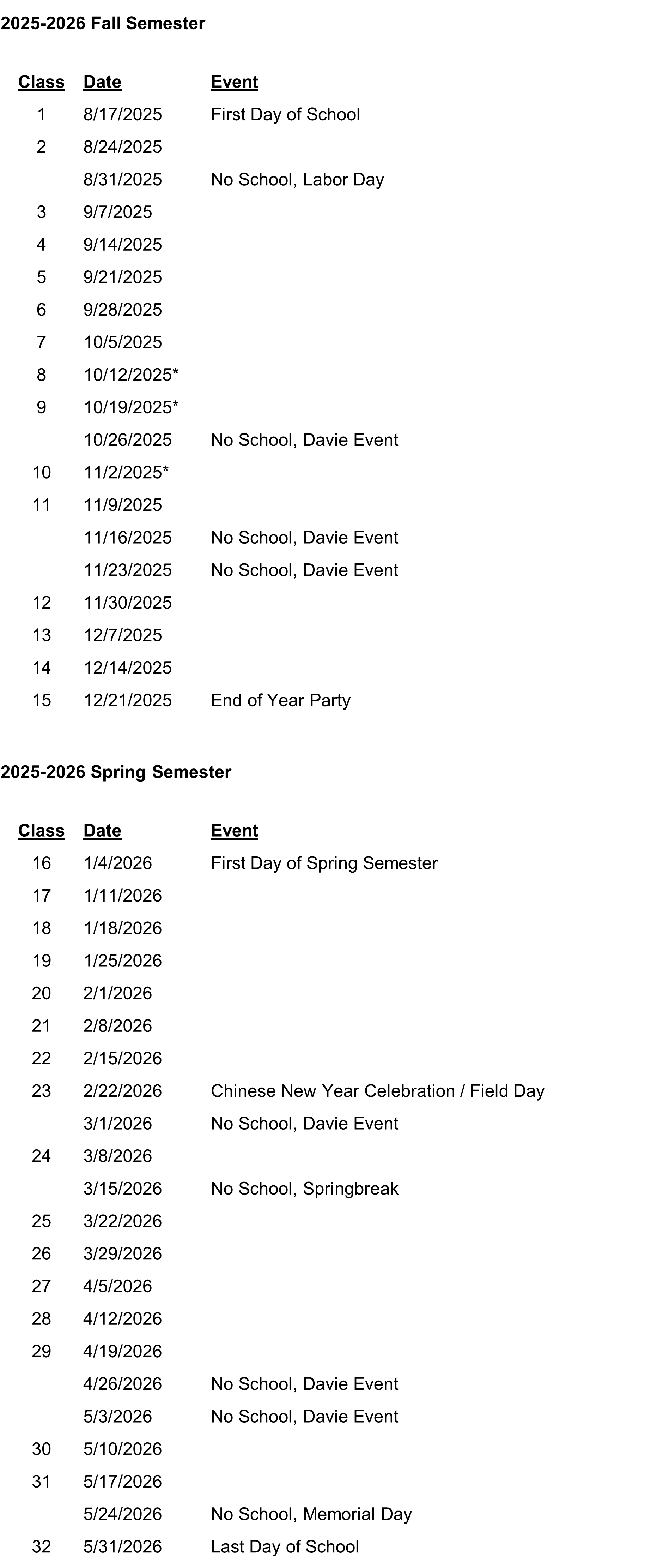 * Note that Class 2A and Class 9 will have classes in GYM between 10:30am and 12:30pm on 10/12, 10/19, and 11/2 due to Davie Halloween event. All the other classes will have regular schedules on those three days.